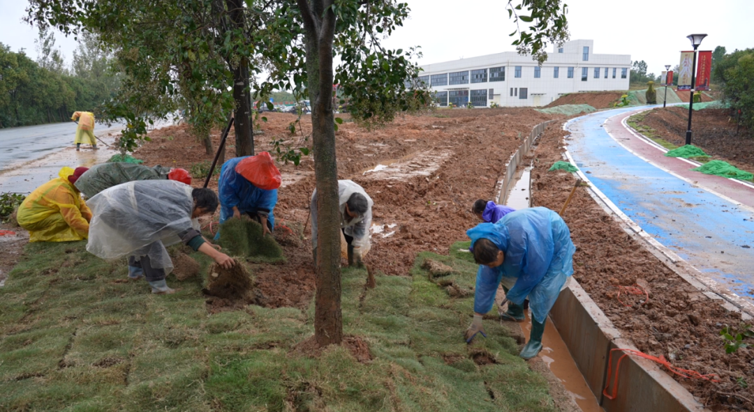 雨丝淅沥,炎帝大道路侧却一派火热景象:工人们正冒雨协作,铲土、铺草、压实的动作连贯有序,12000平方米草坪正加速“铺就”绿意,奏响道路提质“奋进曲”。“我们从各地抽调人力310余名,就是要抢工期、提效率,让炎帝大道更快焕新。” 随县城管局执法监督股负责人刘洋的话语里满是干劲。