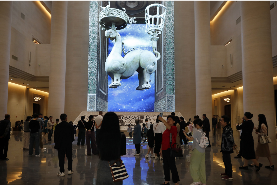 科技赋能不止于VR。在博物馆大厅,裸眼3D大屏让国宝“悬浮”空中;地面压力彩屏随脚步绽放青铜纹样;光子机器人自如穿梭,语音讲解精准对答,成为博物馆最受欢迎的“新员工”。