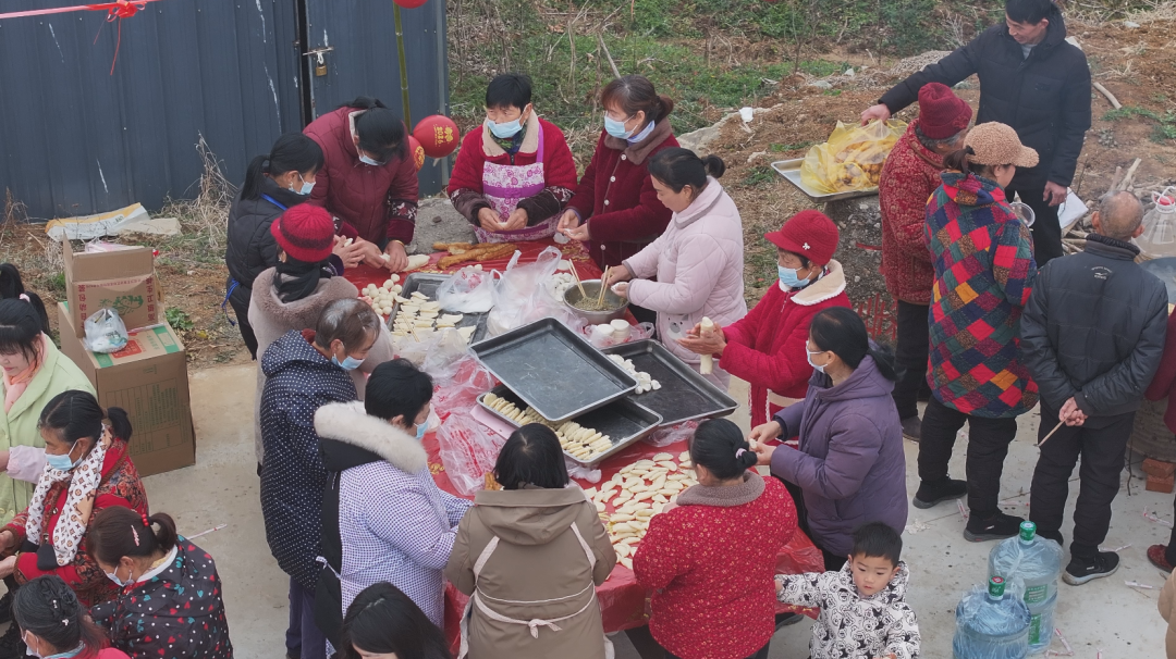 9点刚过,党群服务中心院内早已人声鼎沸。“快来搭把手,这盆馅料快用完啦!”院内一侧,村里妇女齐上阵,揉面、拌馅、包饺子,笑语连连。一旁油锅滋滋作响,金黄酥脆的炸拖啰、油条新鲜出锅,香气四溢,瞬间点燃了年的味道。