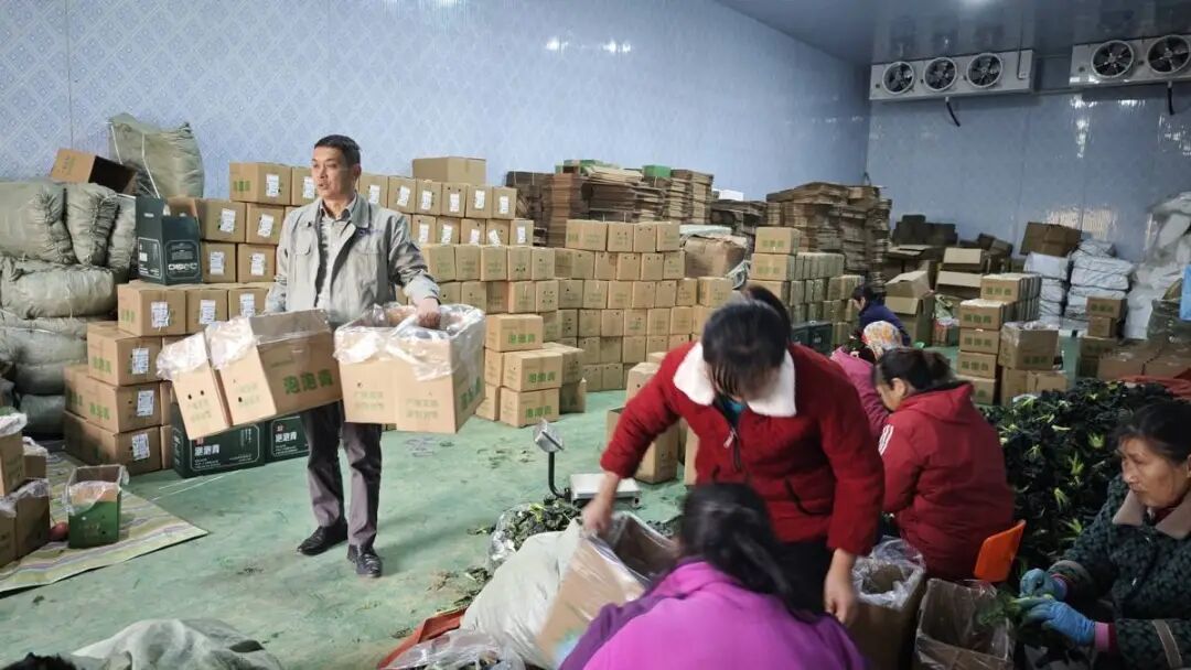 随县安居镇陈家湾村的泡泡青经过采摘、分拣、打冷等步骤后,包装为精美礼盒。