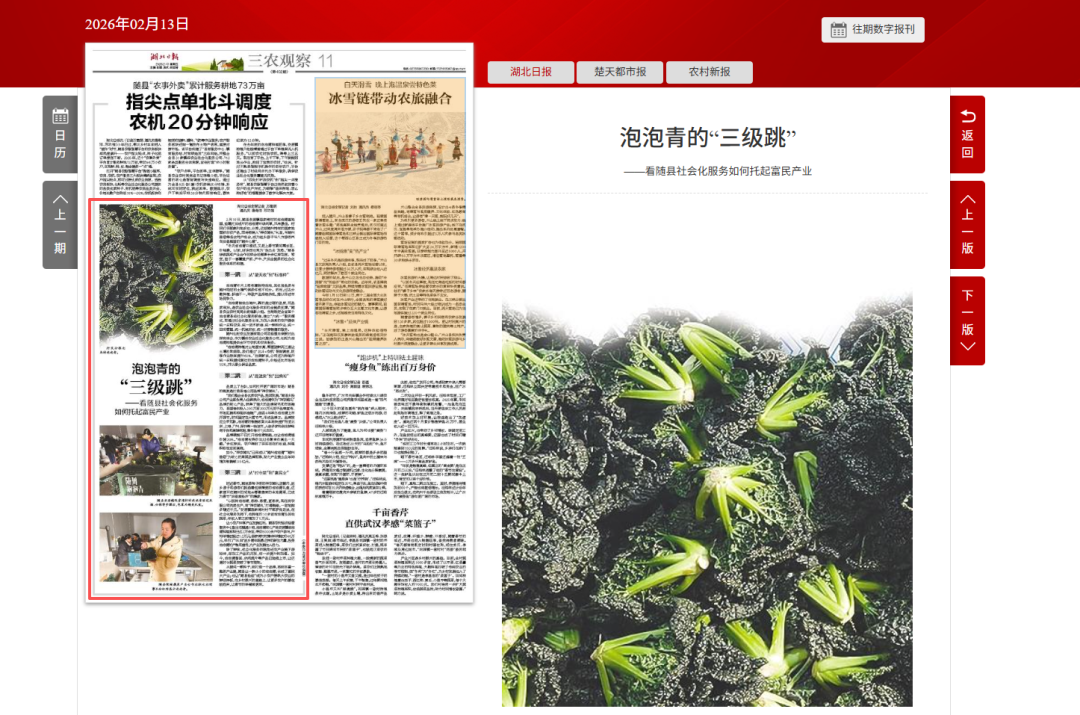 “冬天泡泡青口感好,又赶上春节期间需求旺、价格稳。以前,好东西也常为‘走出去’发愁。”随县绿骏蔬菜产业合作社联合社理事长余红琼坦言。转变,始于一套覆盖产前、产中、产后全链条的社会化服务体系的构建。