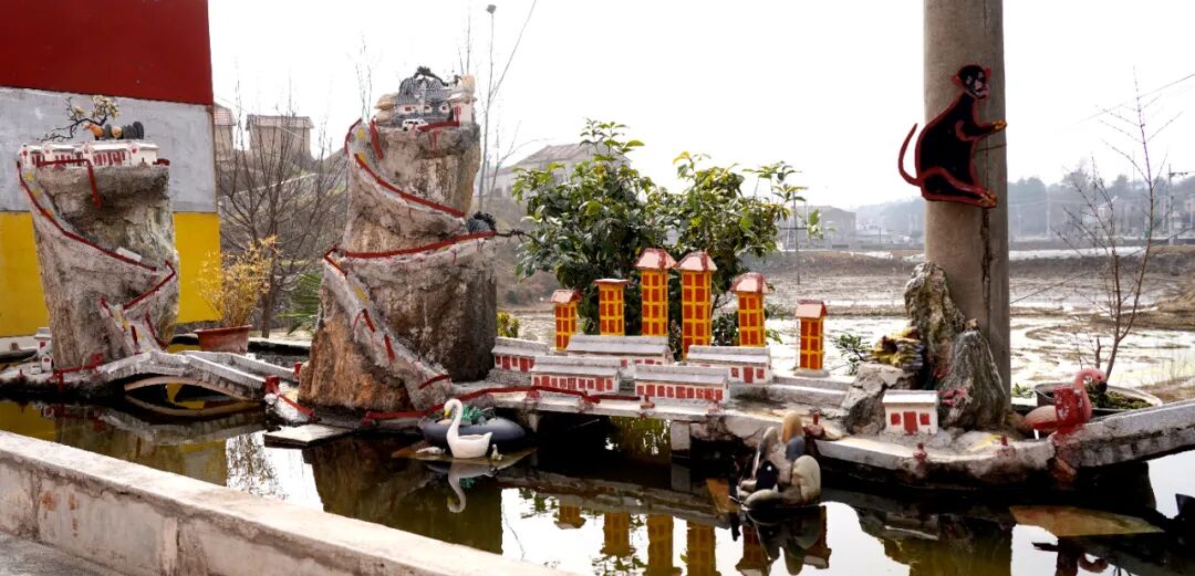步入大石村,村民刘正学的庭院宛如一个微缩的童话天地。屋内窗明几净,屋外由废弃物件巧妙打造的数座微景观连缀成片:山上亭台、小桥流水错落有致,光头强、唐僧师徒等趣味元素点缀其间,为质朴的村居平添了几分灵动与意趣。