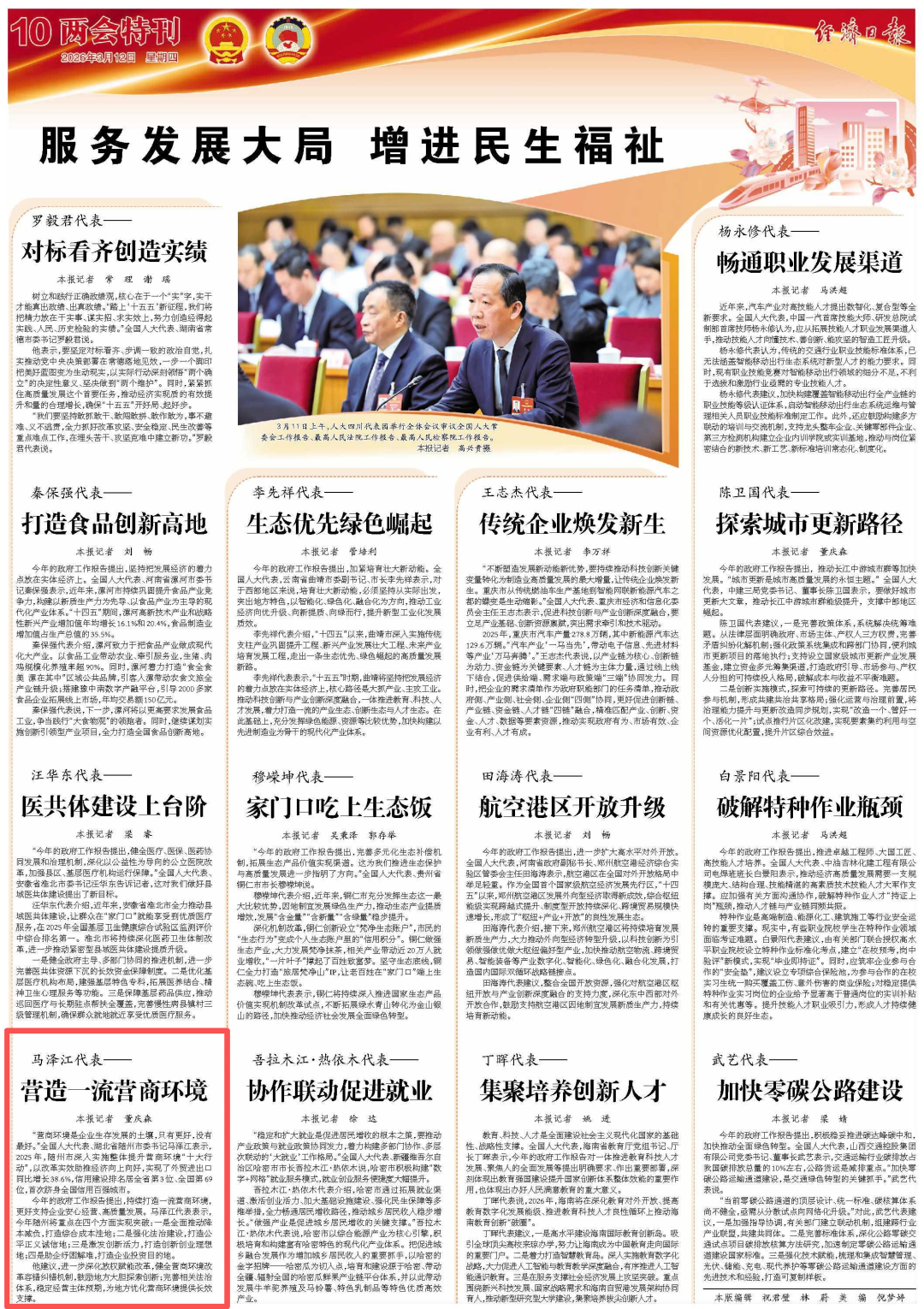 今年的政府工作报告提出,持续打造一流营商环境,更好支持企业安心经营、高质量发展。马泽江代表表示,今年随州将重点在四个方面实现突破:一是全面推动降本减负,打造综合成本洼地;二是强化法治建设,打造公平正义诚信地;三是激发创新活力,打造创新创业理想地;四是助企纾困解难,打造企业投资目的地。