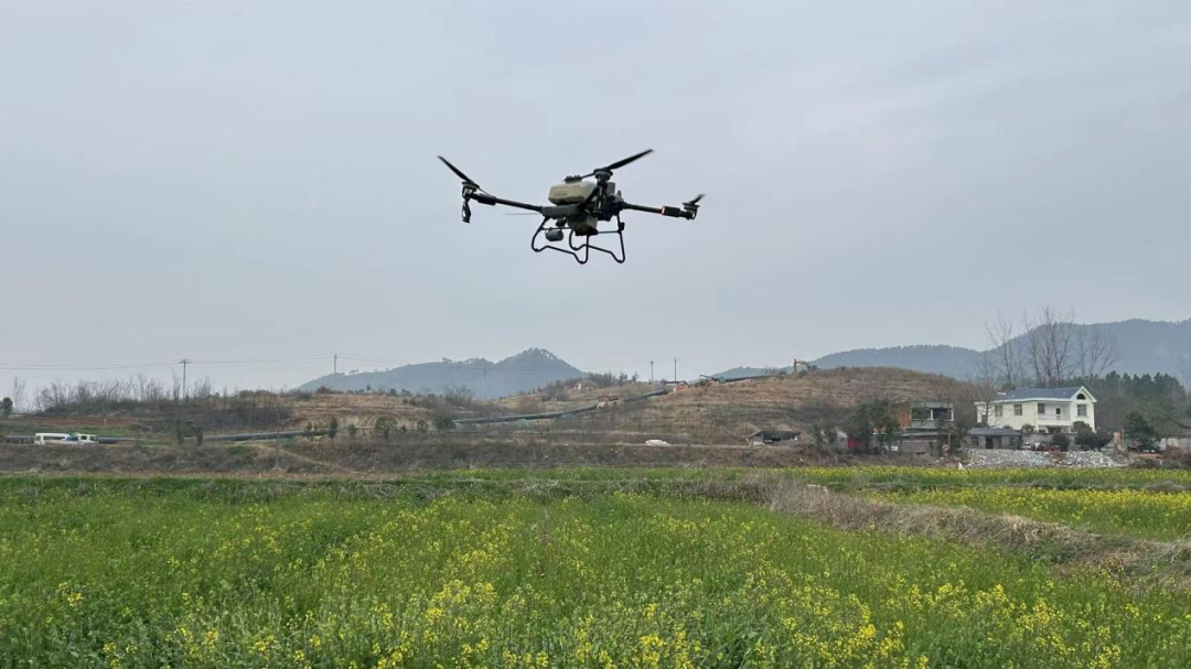 近日,吴山镇农技部门抢抓油菜盛花期关键节点,在辖区高标准农田示范区组织开展“一喷多促”统防统治行动。(张仁健)
